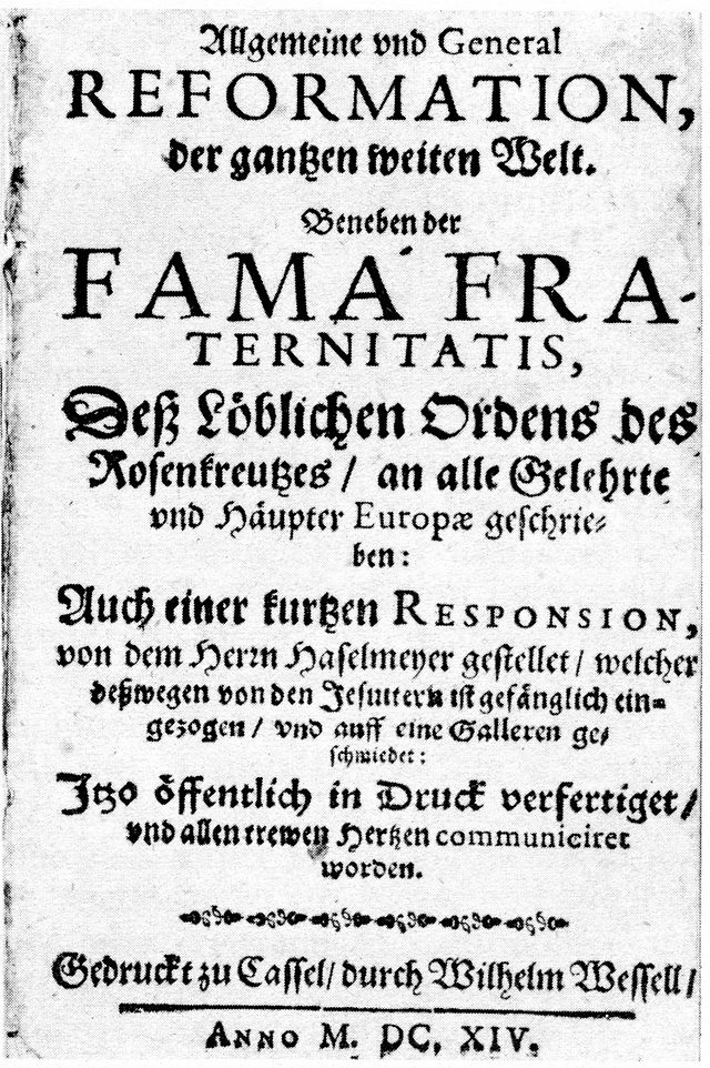 Después según nuestra costumbre, nos dispersamos de nuevo abandonando nuestros tesoros a sus herederos naturales y esperando la respuesta, el juicio y el veredicto de sabios e ignorantes sobre nuestras revelaciones. Aunque seguramente conozcamos la amplitud de la reforma general divina y humana que no sólo satisfará nuestros deseos sino también la esperanza de otros hombres, no es malo en efecto que el sol, antes de salir, proyecte en el cielo una luz clara u oscura; no es malo que algunos se den a conocer y se reúnan para promover nuestra fraternidad con su número y con el prestigio del canon filosófico que deseaba y que dictó Fr. R.´. C.´., o incluso para disfrutar humildemente y con amor nuestros inalienables tesoros, dulcificando así las miserias de este mundo y utilizando las maravillas divinas sin tanta ceguera. Sin embargo, para que cada cristiano pueda apreciar nuestra piedad y nuestra integridad, confesamos públicamente la certeza en Jesucristo en los términos claros y netos con los que ha sido proclamada en Alemania en estos últimos tiempos, y con los que la mantienen y la defienden todavía hoy algunas provincias célebres, contra los fanáticos, los heréticos y los falsos profetas. Celebramos igualmente los dos sacramentos instituidos por la primera Iglesia reformada, con las mismas fórmulas y las mismas ceremonias. En asuntos de gobierno reconocemos como nuestro regente y como regente de los cristianos a la IV Monarquía. Pese a nuestro conocimiento de los cambios que se preparan y al deseo profundo que nos anima de comunicarlos a los que están instruidos por Dios, éste es nuestro manuscrito, el que poseemos. Ningún hombre nos pondrá fuera de la ley ni nos librará a los indignos sin la ayuda del Dios único.